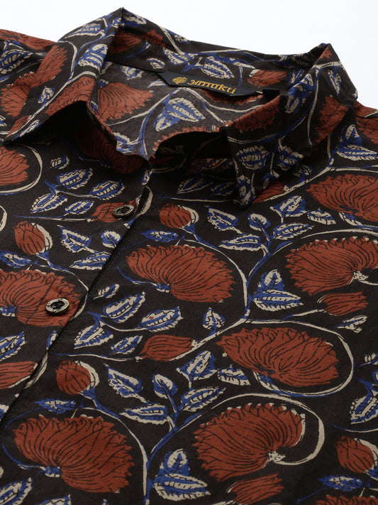 Black Floral Printed V-Neck Kurta