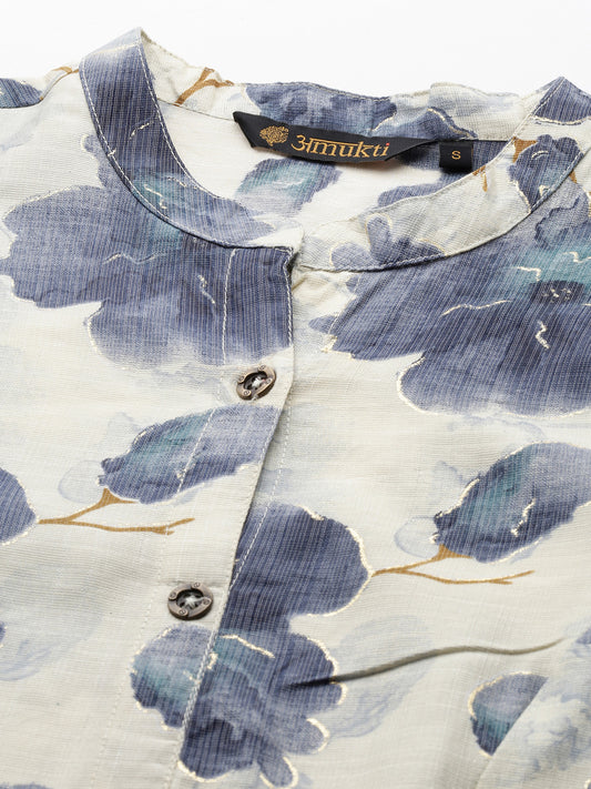 Beige & Blue Floral Printed Kurta