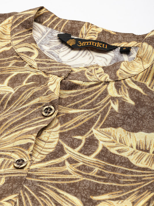 Yellow Ethnic Motifs Printed Mandarin Collar A-Line...