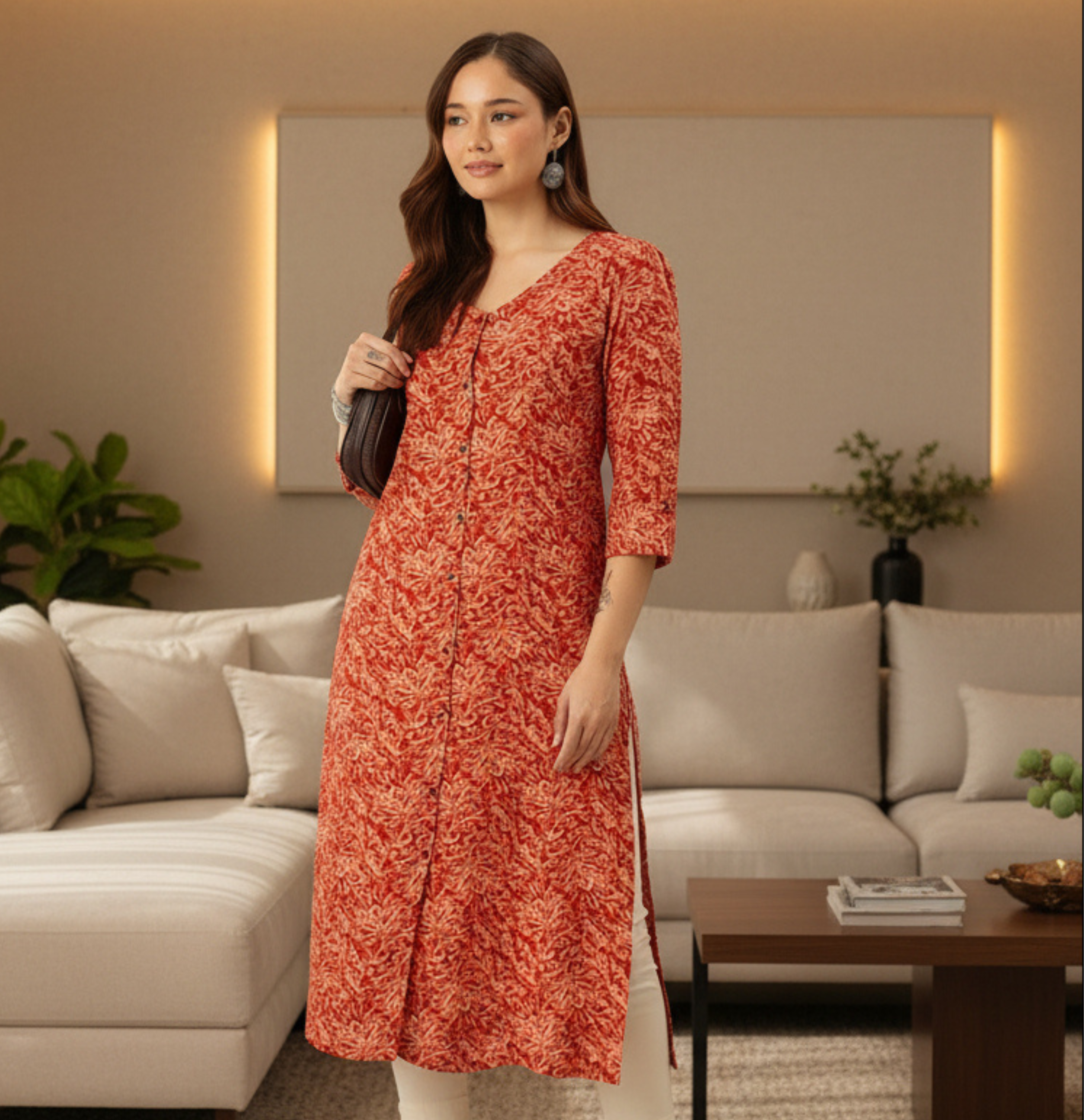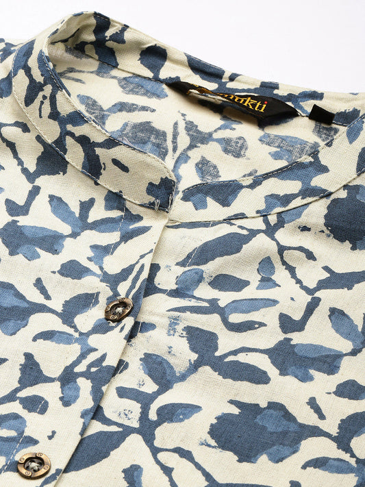 Ivory Floral Printed Mandarin Collar A-Line Kurta
