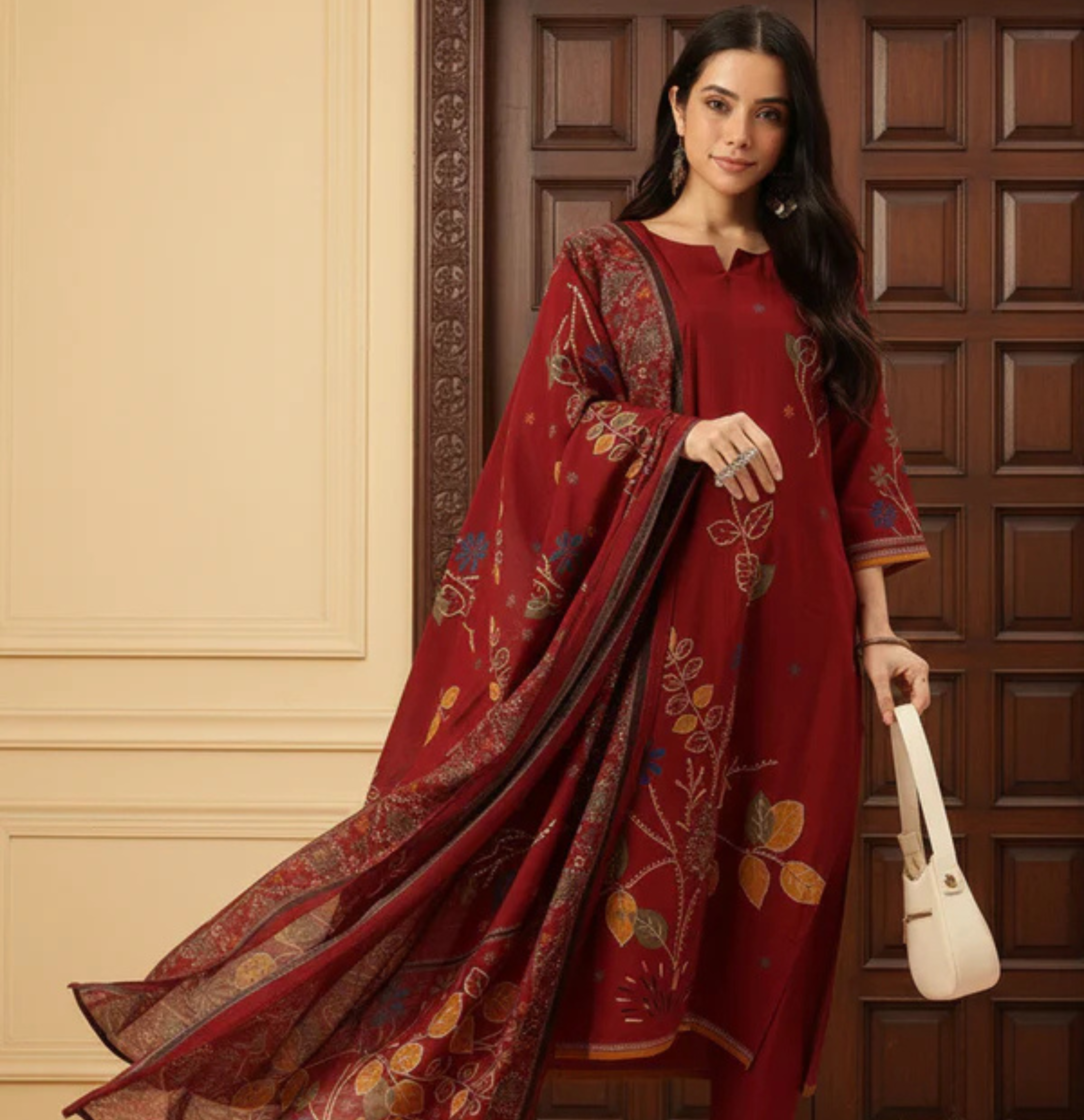 Maroon Pure Cotton Striped Printed Straight Kurta