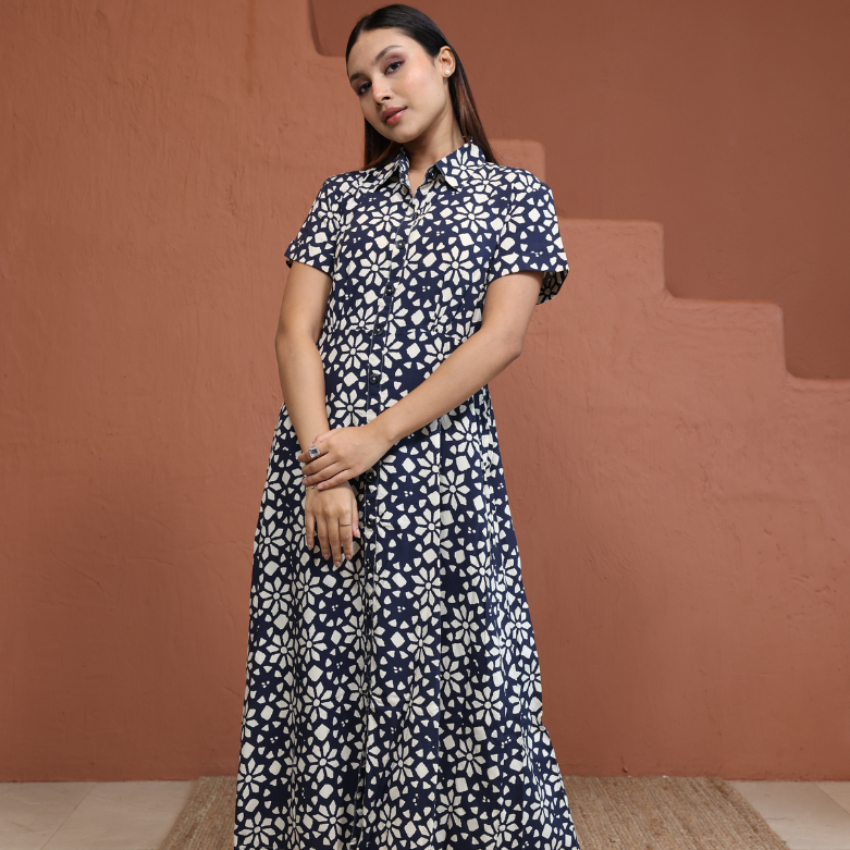 Blue Indigo Printed Mandarin Collar A-Line Kurta