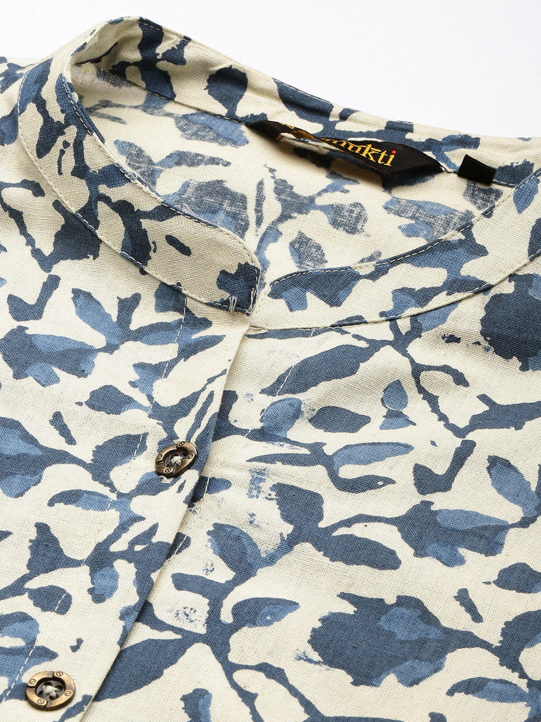 Our Beige & Blue Printed A Line Cotflex kurta features a Band collar neckline and three-quarter sleeves. Adorned with handcrafted fabric buttons, this elegant style is ideal for work and beyond.