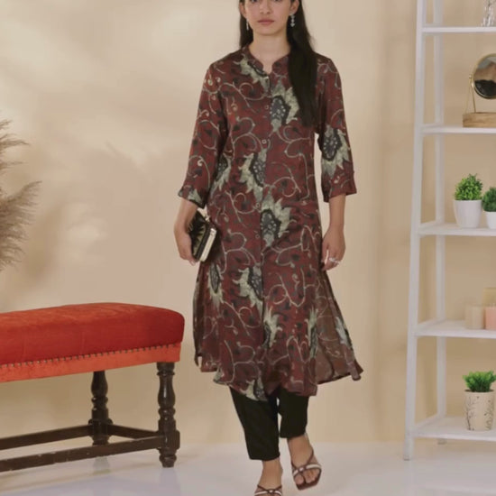 Beige & Brown Floral Printed Mandarin Collar A-Line Kurta