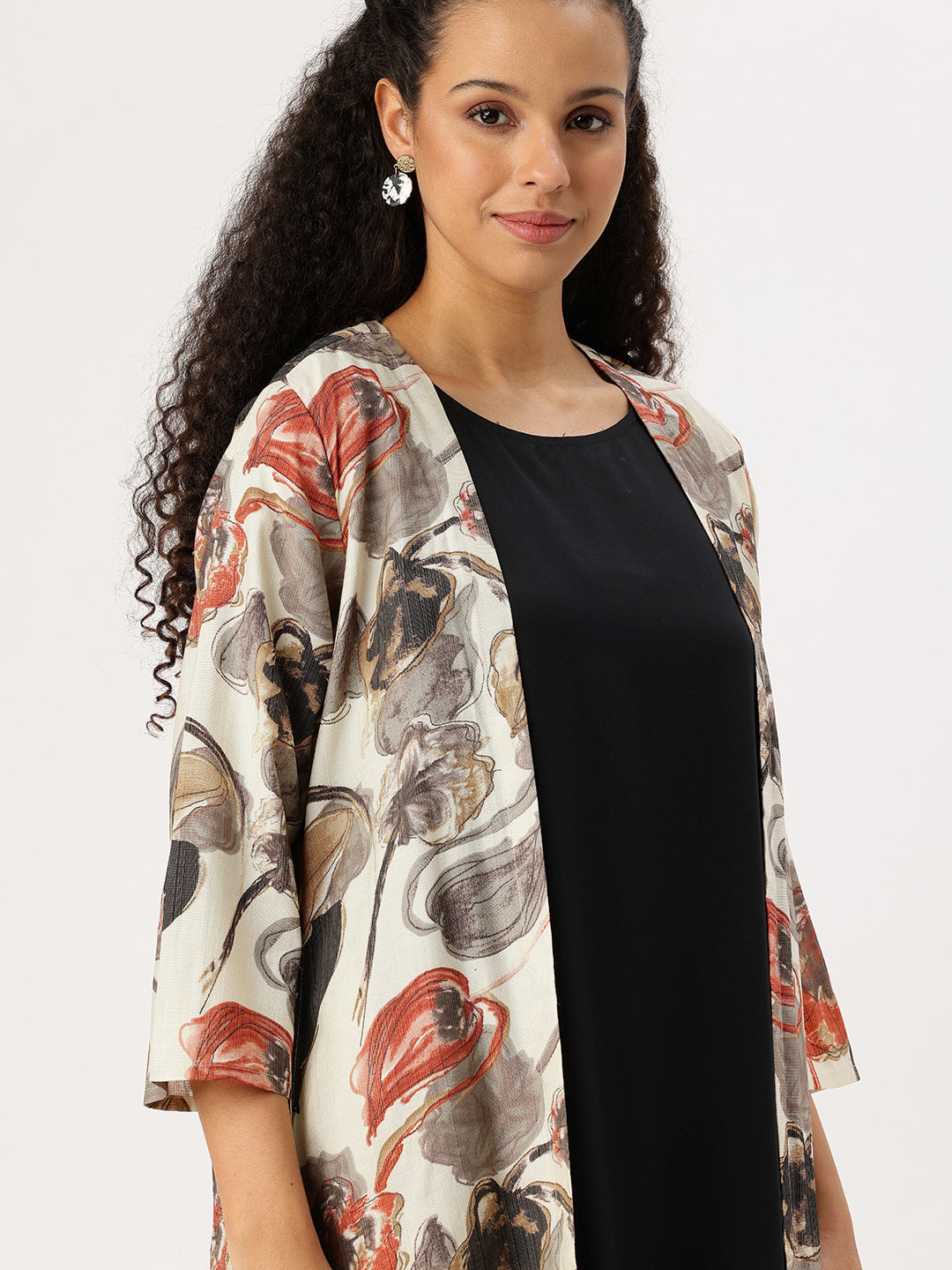 Beige & Black Round Neck A-Line Midi Dress With Shrug, elevated with a Round neck and sleeveless design, is ideal for casual outings.