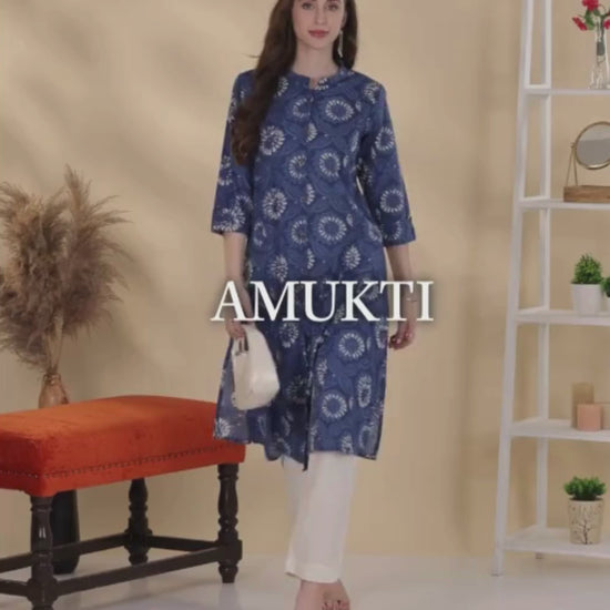 Blue Floral Printed Mandarin Collar A-Line Kurta