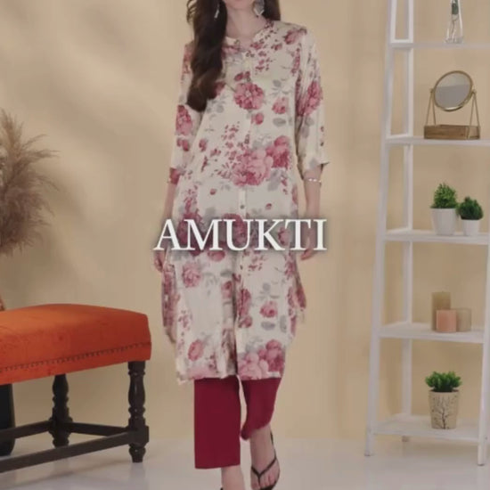 Ivory Floral Printed Mandarin Collar A-Line Kurta