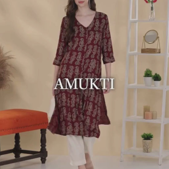 Rust Ethnic Motifs Printed A-Line Kurta, Red Kurta, V-neck, A-line Kurta